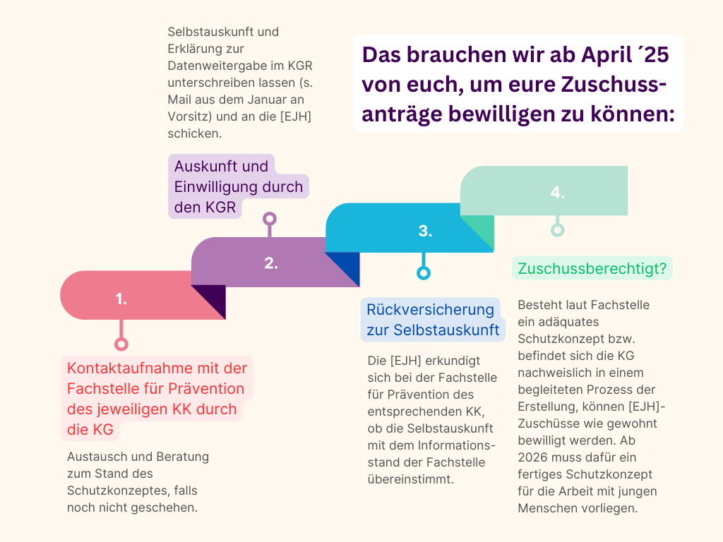 - Die fachliche Prüfung der Schutzkonzepte übernimmt die jeweilige Fachstelle für Prävention eures Kirchenkreises. Dort sollte euer Schutzkonzept mit etwas Vorlauf zum 01.04.25 vorliegen. Wir haben den Vorsitzenden der KGR im Januar eine Mail geschickt, in der sich u.a. eine Selbstauskunft zum Stand des Schutzkonzeptes und eine schriftliche Einverständniserklärung zur Weitergabe der Daten an die [EJH] befindet. Diese muss ausgefüllt und unterzeichnet an die [EJH] zurückgeschickt werden. Anschließend darf die [EJH] von der Fachstelle für Prävention eures Kirchenkreises darüber informiert werden, ob dort ein fachlich adäquates Schutzkonzept vorliegt bzw. ein Erarbeitungsprozess läuft. Wird das Einverständnis zur Weitergabe der Daten nicht gewährt, können wir als [EJH] leider zukünftig keine Zuschüsse an euch auszahlen.
